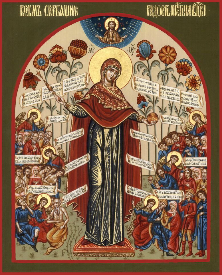 “Joy of all who sorrow, and intercessor of the offended, feeder of the hungry, consolation of travelers, harbor of the storm-tossed, visitation of the sick, protection and intercessor of the infirm, staff of old age, Mother of God on high. Thou art the immaculate, hasten we pray thee, to save thy saints.”